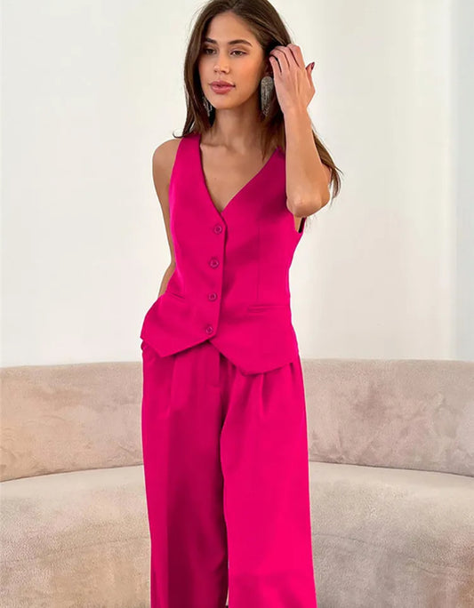 Elegant V-neck vest, sleeveless fashion set, wholesale, casual long pants with buttons, high waist suit